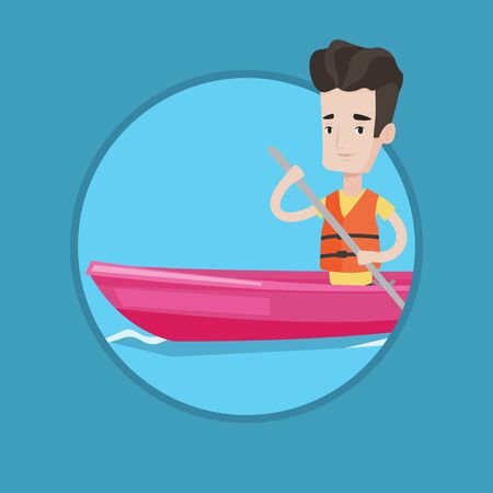 川でカヤックに乗ってスポーツマン カヤックで旅の若い白人男 男性のカヤッカー パドリングします カヌーを漕ぐ人 ベクター背景に分離されたサークルでフラットなデザイン イラスト のイラスト素材 ベクタ Image