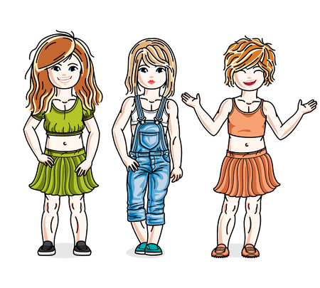 おしゃれでカジュアルな服装でポージングした可愛いハッピーリトルガールズ ベクトルダイバーシティキッズイラスト セット 子供時代と家族のライフスタイルクリップアート のイラスト素材 ベクタ Image